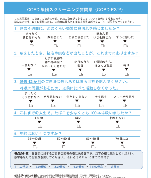 喫煙者の方で咳や痰が気になる方はいませんか?まだ精密検査を受けてない方は、まずは、下記のCOPDーPSの質問に答えてみてください。4点以上の方は要注意で精査対象となりますので、当院にご相談くださいね。ちなみに喫煙歴があって、70歳以上の方はそれだけで4点となり精密検査扱いになります、、、。尚、この質問票は世界中で使用されているものです。